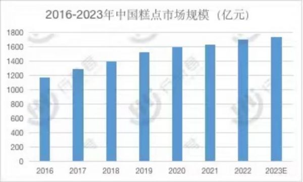 2020年我国糕点市场规模为1596.3亿元,到2023年我国糕点市场规模增约1740.5亿元。