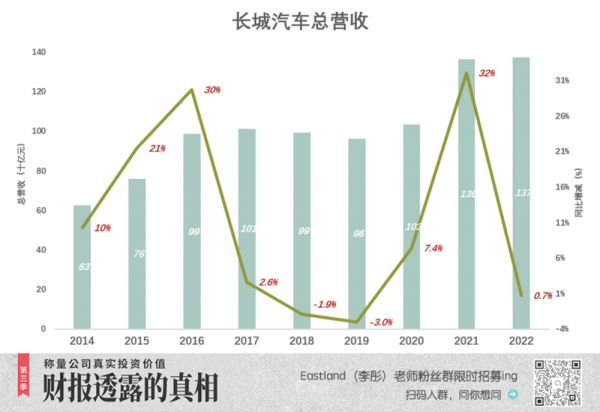 2016年长城汽车营收986亿、同比增长30%;2017年勉强突破“千亿大关”后连续回落,2019年营收降至962亿。