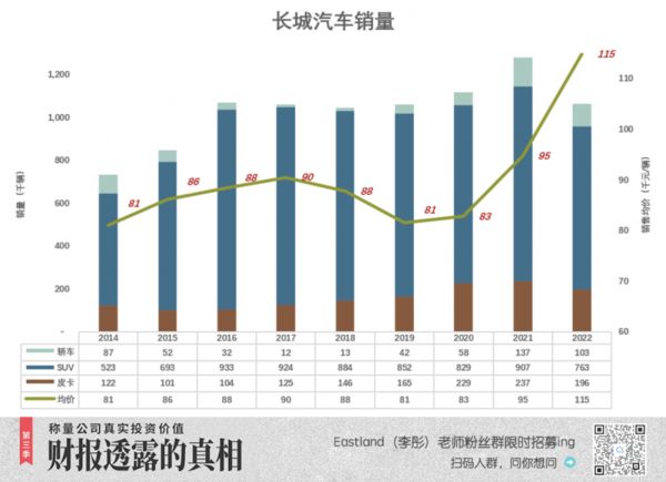 值得称道的是,长城汽车出厂均价在9万以下徘徊多年,2021年突破至9.5万/辆、2022年进一步提高至11.5万/辆(注:单车均价、单车成本根据年报披露的销量及整车销售收入、整车业务成本推算)。