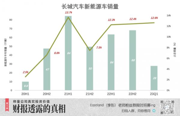 2023年,长城汽车销量目标为160万辆、其中新能源车占比40%。在刚刚过去的一季度,总销量、新能源车销量分别为22万辆、2.8万辆。销量完成年度目标的13.8%,新能源车占比12.6%。