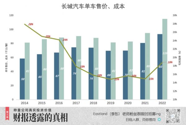 2014年,长城汽车销售均价8.1万元、单车成本5.8万元、毛利润率28%,比吉利、比亚迪高出近10个百分点!