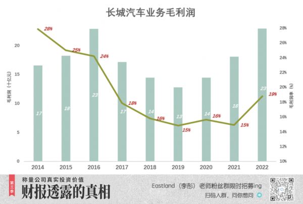 2022年,长城汽车销售均价提高到11.5万元,单车毛利润2.2万元,毛利润率回升到19.4%,高于吉利、低于比亚迪(20.4%)。
