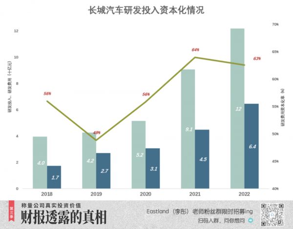 假如2022年研发投入资本化率只有50%,长城汽车净利润将减少15亿,相当于净利润的18%。