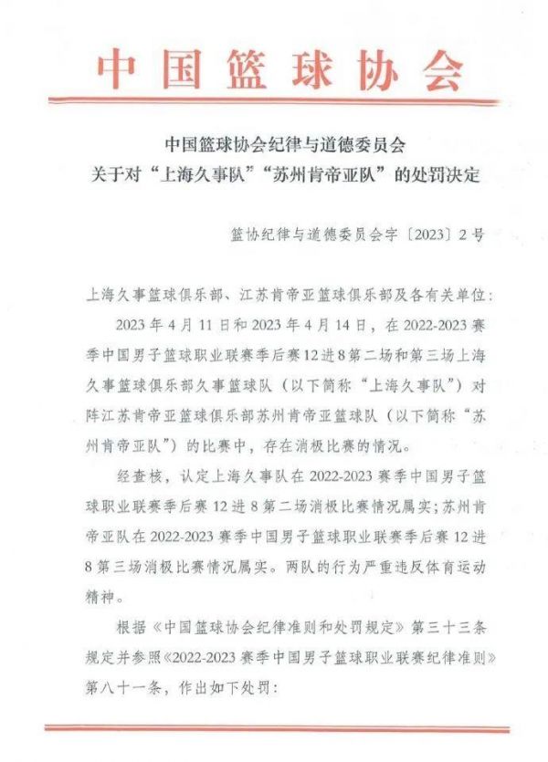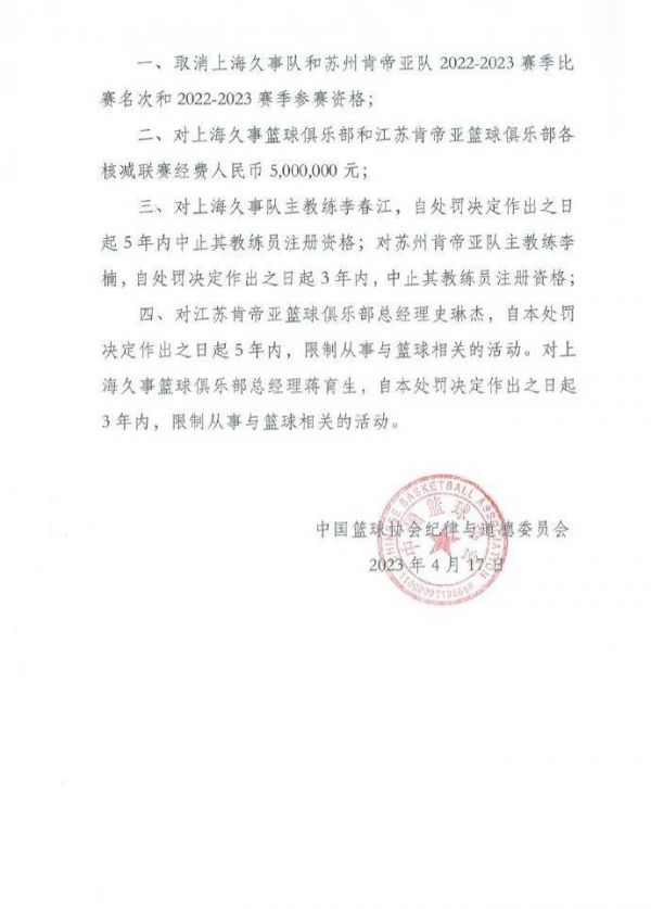认定在上海久事队与苏州肯尼亚队在2022-2023赛季CBA季后赛12进8第二、第三场比赛中,存在消极比赛的情况,并表示“两队行为严重违反了体育运动精神”。取消上海队江苏队本赛季比赛名次和参赛资格,各核减联赛经费人民币500万元。上海主帅李春江禁赛5年,江苏主帅李楠禁赛3年。