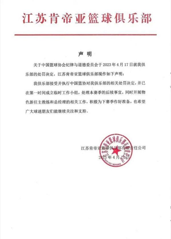 此外,对江苏肯帝亚篮球俱乐部总经理史琳杰,自处罚决定作出之日起5年内,限制从事与篮球相关的活动。对上海久事篮球俱乐部总经理蒋育生,自处罚决定作出之日起3年内,限制从事与篮球相关的活动。