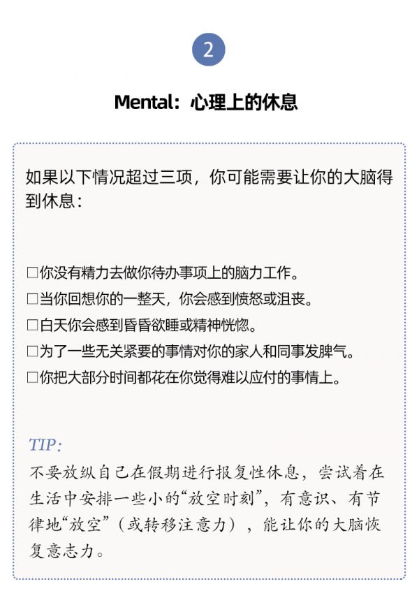 单靠某一个具体的假期、某一种具体的活动(社交或者睡觉),并不能让我们恢复到完全休息好了的状态。