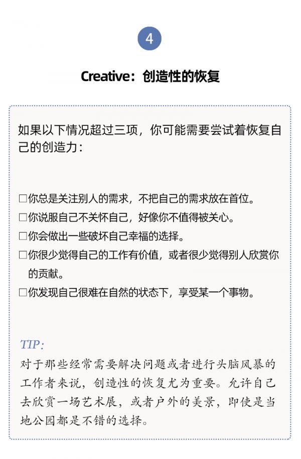 换句话说,当你处于一种良好的休息活动中,你会感到非常松弛,你不需要使用意志力来抵制工作,或者摒弃对其他事务的担忧。