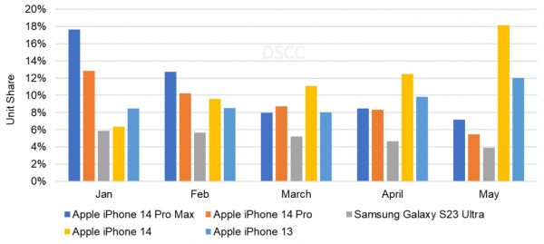 不过在 2023 年 3 月,最畅销的 OLED 屏幕旗舰机型是 iPhone 14。DSCC 在报告中称,在 iPhone 发布初期,消费者热衷于购买 Pro 机型,而后续的消费者更倾向于购买入门机型。