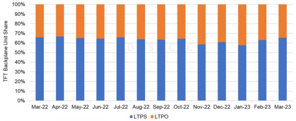 2022 年 3 月-2023 年 3 月,LTPS 和 LTPO 面板的占比情况