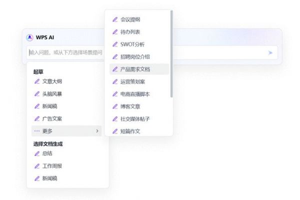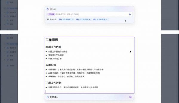“WPS AI”提供的起草、改写、总结、润色、翻译、续写等功能。用户在和AI的交互过程中,还可以插入一篇或多篇已有的文档,作为AI内容生成的参考素材,使生成的内容更具备用户已有内容的相关性,例如插入多篇工作日报,让AI生成出一周的工作总结。