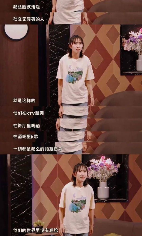 他们 “营业”后的创伤和疲惫,往往需要用时间独处疗愈。但在“充能”的过程中,他们的脑子里又总会自动循环播放假装外向时,拿自己开涮的“丢脸”行为,然后尴尬到脚趾抠出三室一厅。