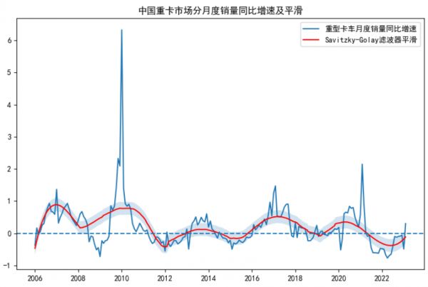 另外一个对反弹的支撑是小区间的周期。如果我们将2006年以来中国重卡月度销量的同比增速做一个简单的平滑,也就是上图中间的这根红线。我们可以很明显地发现,这根红线虽然整体还在0以下,但已经表现出非常明显的抬头趋势。