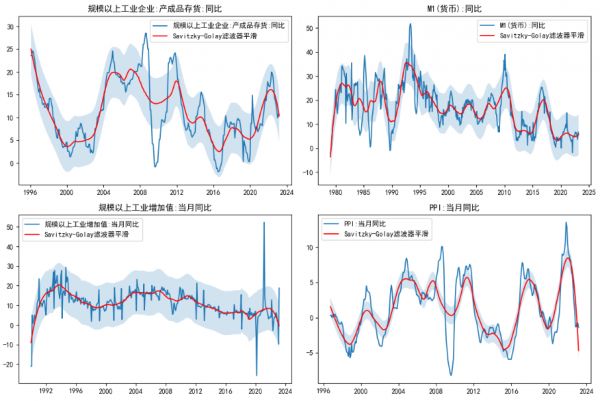 从我们上面的四个图也可以发现,货币类的M1同比指标已经出现拐头向上的趋势,右下角价格类的PPI目前还是个大幅向下的趋势,而左上角存货类的产成品存货明显就是刚刚掉头向下。