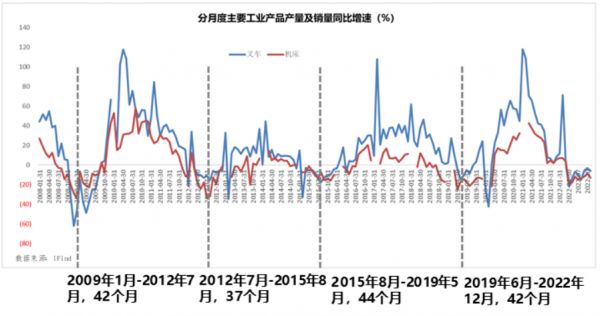 2009年1月至2012年7月这一波持续42个月的基钦周期,波动非常剧烈,高点对应在2010年初,随后就是下行,重卡销量也是从2010年达峰之后就一路下行。从2009年到2019年经历了三个基钦周期,耗时10年,大约相当于一个朱格拉周期的时间,这也与重卡从2010年到2020年的这一个周期基本一致。