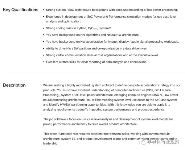 “有了这些知识,您就可以将其应用于分析影响系统性能和产品体验的需求权衡。该工作将侧重于用例级分析和开发系统级模型的功率、性能和延迟,以推动整体产品架构。”这个跨职能角色需要出色的人际交往能力,与相机模块、架构和系统 EE 等部门通力合作。关于工作的具体要求则如下所示。