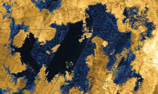 同时,有机尘暴侵蚀了土卫六的表面,塑造出丰富多样的地貌特征,探测器在这颗卫星上找到了包括山脉、平原、盆地、火山和撞击坑等一系列结构。在土卫六上曾发现一座高达1000米的休眠冰火山,其周围被巨大的沙丘所环绕,且具有深达1200米的火山口。这是人类目前在卫星上探测到的最大的冰火山之一。当其爆发时,会释放出大量炽热的融冰和气体。土卫六的南极区域还有一个非常大的湖泊——克拉肯海(Kraken Mare),这是太阳系中最大的液态甲烷湖泊。