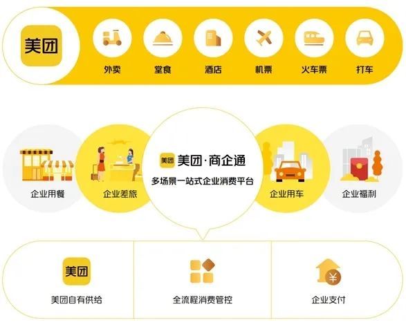 如今,美团试图在企业消费市场复制这套逻辑。以企业用餐为口子,实则涵盖工作餐、商务宴请、企业差旅、企业用车等多元场景服务。