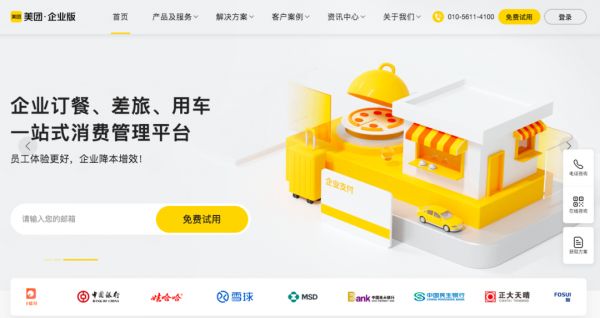 2015年12月,美团推出商企通(美团企业版前身),早期主要服务内部员工,提供用餐福利、差旅和商务用车等基础功能,这也是美团在B端餐饮消费市场的一次试水。