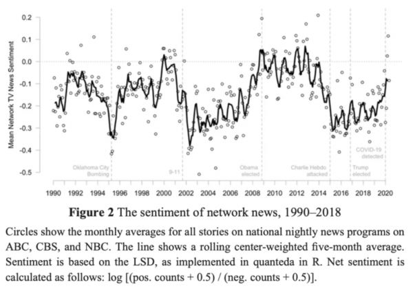 他和另一位合著者,密歇根大学的扬娜·克鲁普尼科夫(Yanna Krupnikov),使用词汇编码情感词典分析了1990年至2018年美国全国广播公司(NBC)、美国广播公司(ABC)和哥伦比亚广播公司(CBS)晚间新闻节目的情感倾向。他们没有发现任何下降趋势,但情感倾向的波动性很大。有时(特别是在恐怖袭击后)报道会格外消极;有时(例如在贝拉克·奥巴马当选总统后)报道会格外热情洋溢。但总的来说,没有明显的趋势线。