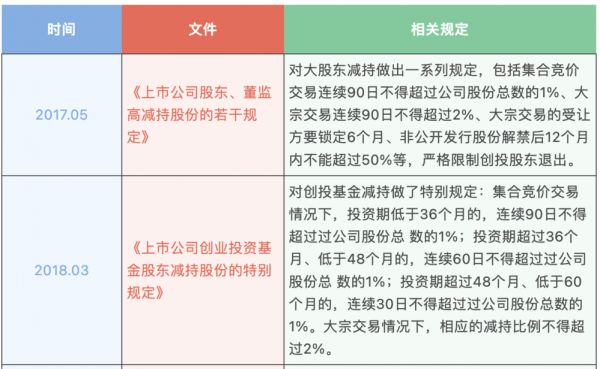 其次,2018年3月,证监会针对创投基金类股东的减持出台了《上市公司创业投资基金股东减持股份的特别规定》,将创投基金的减持与投资期限反向挂钩,为创投基金的减持给予了一定的政策优惠。但在实操层面,对VC相关资格的认定则比较繁琐,执行起来也没有那么容易。