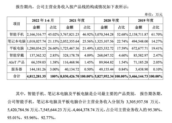 龙旗科技的产品线中没有笔记本电脑,而华勤技术与闻泰科技的产品线中,笔记本电脑都占一定比例。