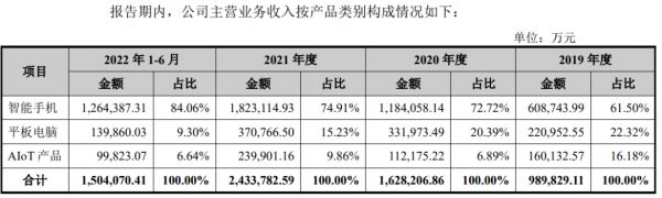 龙旗科技于 2020 年提出“1+Y”发展战略,计划开拓智能手机以外的智能产品。然而公司业务营收组成中,对智能手机业务依赖愈发加深,占比有逐年递增的趋势,到 2022 年 6 月智能手机占比达 84.06%。