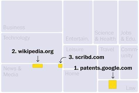 C4数据集的网站主要来自新闻、娱乐、软件开发、医疗和内容创作等行业。这可以解释为什么这些领域可能受到新一波人工智能的威胁。排名前三的网站分别是:第一名是谷歌专利搜索,它包含世界各地发布的专利文本;第二名是维基百科;第三名是只接受付费订阅的数字图书馆Scribd。此外,排名靠前的其他网站还有盗版电子书市场Library(第190位),这个网站因非法行为被美国司法部查封。此外,数据集中还存在至少27个被美国政府认定为盗版和假冒产品市场的网站。