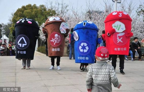 上海,4个由环保志愿者扮演的垃圾分类箱人偶