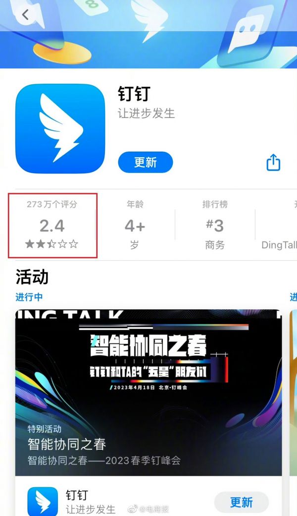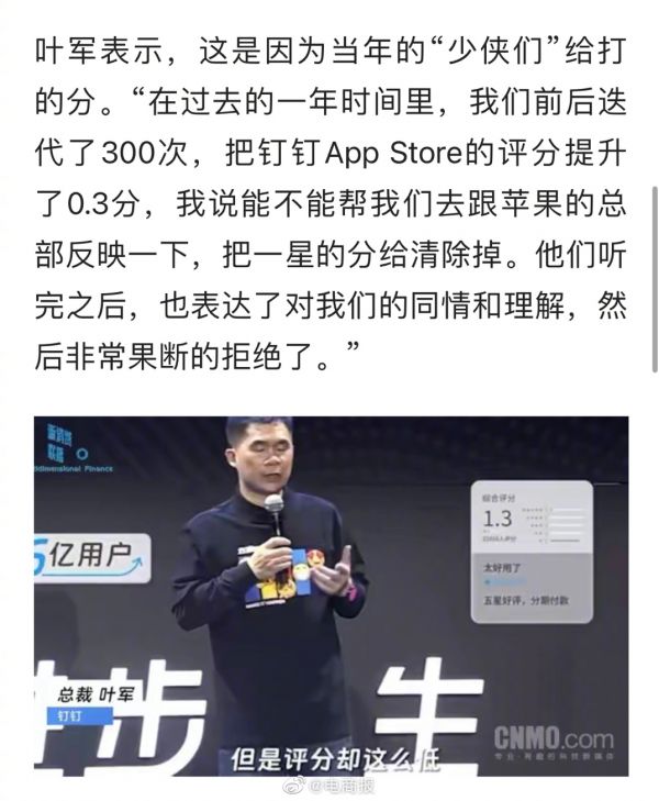 #钉钉总裁回应App评分2.4# 钉钉总裁:当年“少侠们”打分太低,钉钉一年迭代300次评分才增长0.3。曾想清除App Store一星分数,苹果深表同情后果断拒绝了。[允悲]#钉钉一年迭代300次#