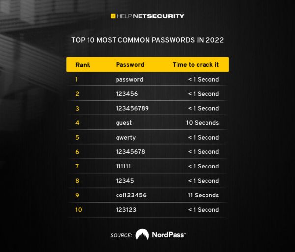 根据密码管理工具 NordPass 公布的名单,2022 年互联网上最常用的密码还是“password”,而排名第二位和第三位的分别是“123456”和“123456789”。不到一秒钟,黑客就能破解这些密码。在全世界最常见的 20 个密码中,有 18 个都可以在一秒钟之内被破解。