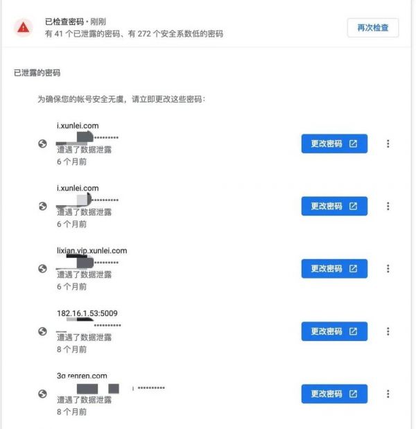 如果你使用 Chrome 浏览器的密码管理器的话,它还会提醒你有哪些密码已经被泄露了。