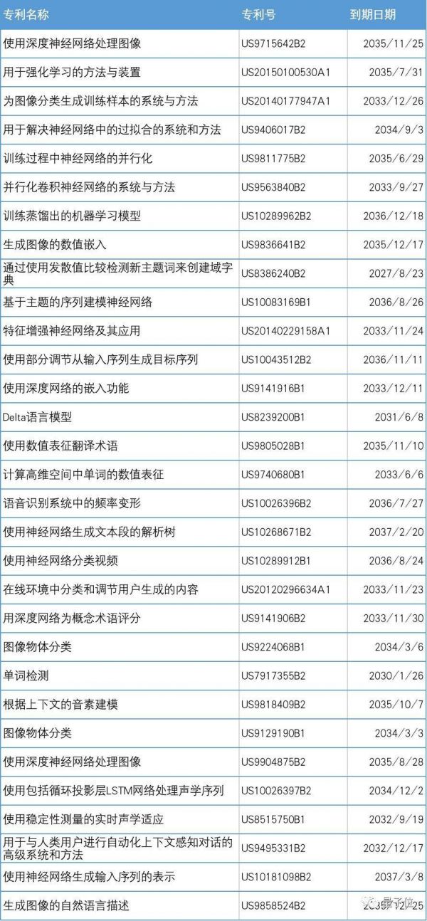 其中,“用神经网络生成音频”专利已经在美国生效,2037年9月6日到期。“用卷积神经网络处理序列”“用神经网络处理文本序列”专利也都处于“pending”状态。