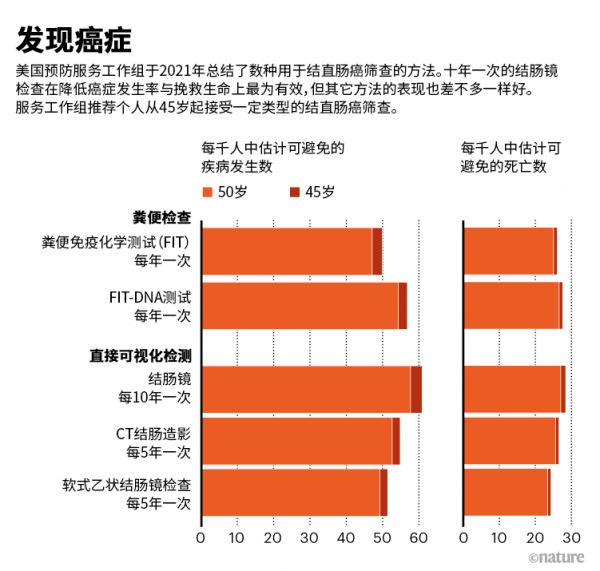 单凭一项研究评估不了癌症筛查这么复杂的事。多年来,越来越多的研究证据均支持结肠镜检查的应用,其中包括了数项大型研究,表明该检查项目在部分情况下带来重大获益。在2021年的一篇综述[2]中,USPSTF发现在多项观察和模型研究中,接受结肠镜筛查的人群罹患结直肠癌的风险较低,估计风险降幅为40%至69%;死亡风险也较低,估计风险降幅为29%至88%(见“发现癌症”)。对于每1000名接受结肠镜检查筛查的人群,模型表明早期发现结直肠癌可挽救多达28人的生命。