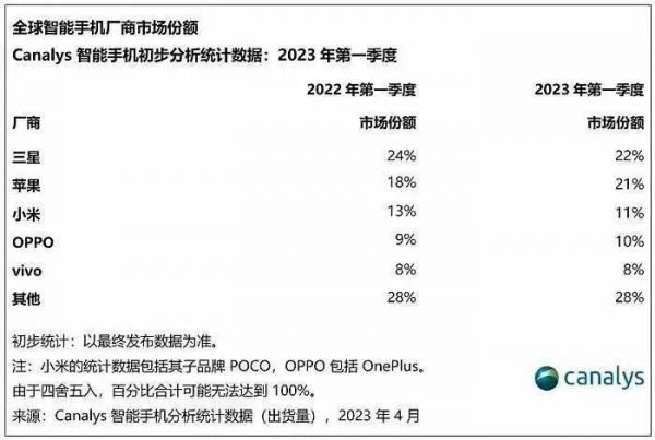 受去年年底发布的iPhone 14 Pro系列稳固需求的推动,苹果与三星之间单季度的市场份额差距正在缩小,2023年第一季度仅为1%。2022年第一季度两者的差距为6%。