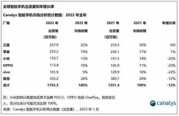 事实上,拉长至整年数据来看,三星始终是全球的出货霸主。2022年全年,三星旗下智能手机全球出货量达到25.8亿台,占市场份额的22%;苹果为23.2亿台,占19%。
