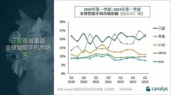 继去年第四季度全球智能手机市场份额被苹果超越后,三星在今年一季度以微弱优势重回第一。