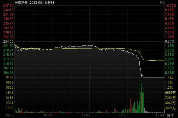 当天下午,长春高新股价跳空1.78元低开并持续低迷,13时40分开始卖单大量增加,14时加速下跌,14时27分跌停,最终以202.10元/股的跌停价收盘,全天成交24.27亿元,当日市值蒸发超90亿元。
