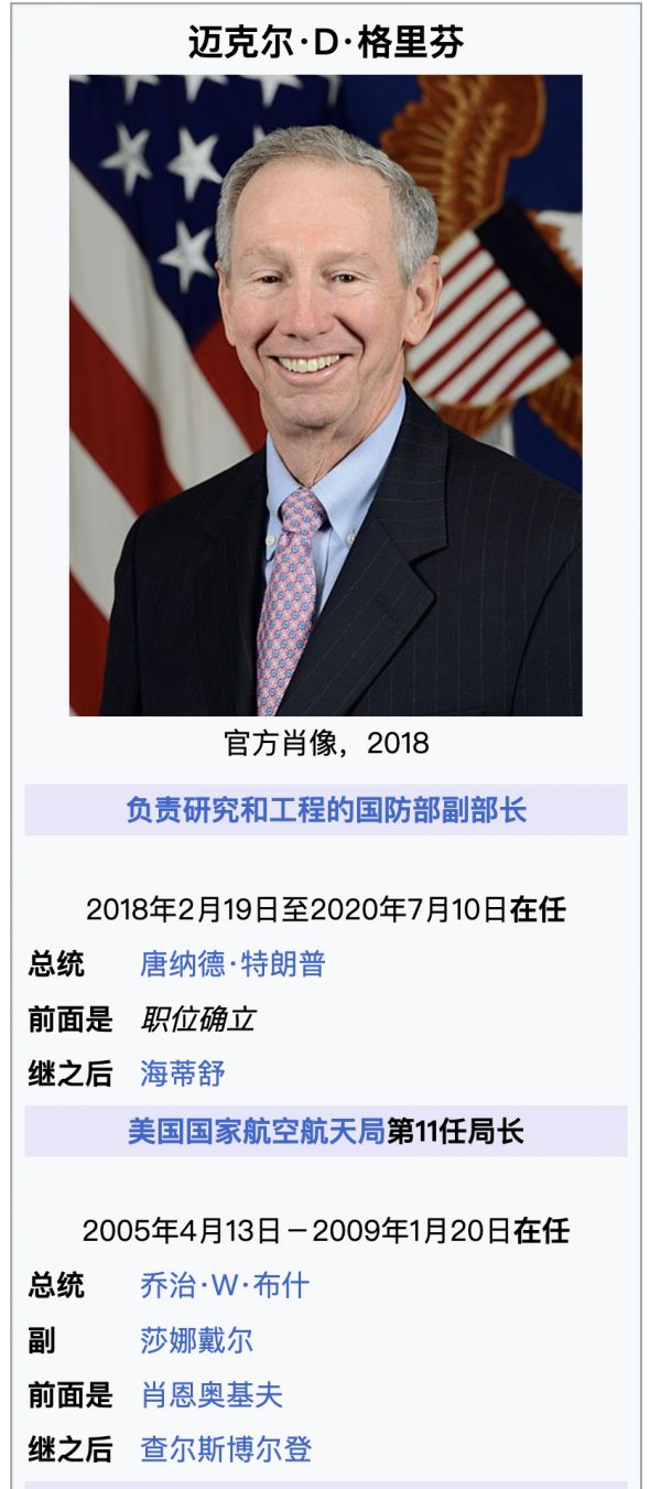 2005年,格里芬同学升官了。从IQT的CEO变成了NASA掌门人——直接成了美国航天系统的一把手。