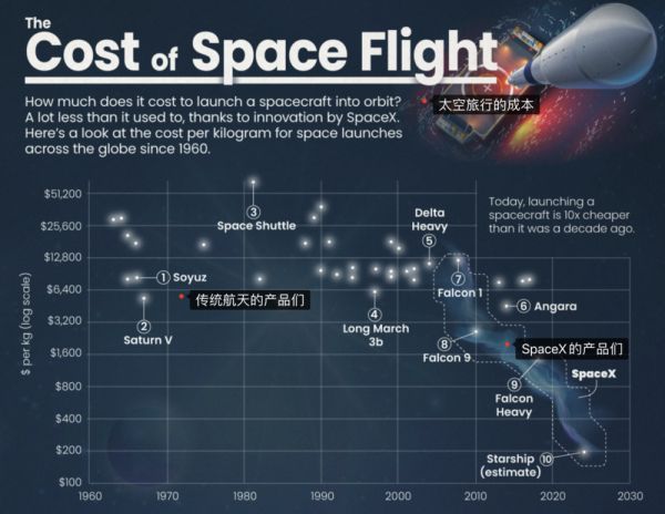 而最新的“猎鹰9号”和“猎鹰重型”则已经可以把成本下探到3000美元以下,最低只要不到1600美元。如果“Starship星舰”成熟,这个价格将会跌到200美元/公斤的水平。