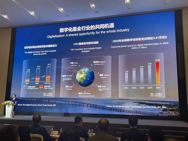 孟晚舟在华为年度分析师大会上给出了两组数据,2020年全球经济中数字经济占比约为20.7%,预计到2025年占比将增加到24.3%,2022年全球数字化转型支出约1.89万亿美元,2026年将达到3.4万亿美元,孟晚舟认为,“这是整个产业链的新蓝海。”