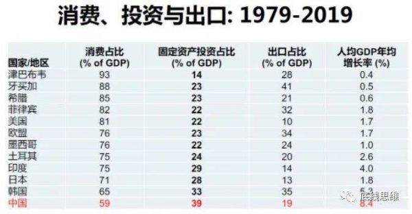 无论是经济理论还是实际的数据都告诉我们,消费和出口本身不能带来经济增长,中国之所以经济增长快,恰恰是因为中国是世界上投资占比最高的国家,占GDP的39%,这是中国经济增长最重要的特征之一。