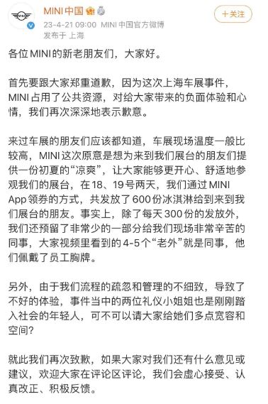 然而,宝马本次的精心策划和高调宣传,已经随着昨天MINI展台冰淇淋事件化为乌有。相信读者们大概都已经了解了事件经过,这里就不再转述。有一点需要指出,虽然在直观上这次事件的主要责任在两名工作人员,但以这类车展一般的事先规划机制,现场一些后续视频和宝马事后那远不如ChatGPT写得有诚意的公关回应来看,这类区别对待的“潜规则”显然与国外豪门企业长期高高在上的姿态不无关联。