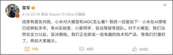 在4月14日的博文中,雷军表示,小米在AI领域已经耕耘多年,有AI实验室、小爱同学、自动驾驶等团队。