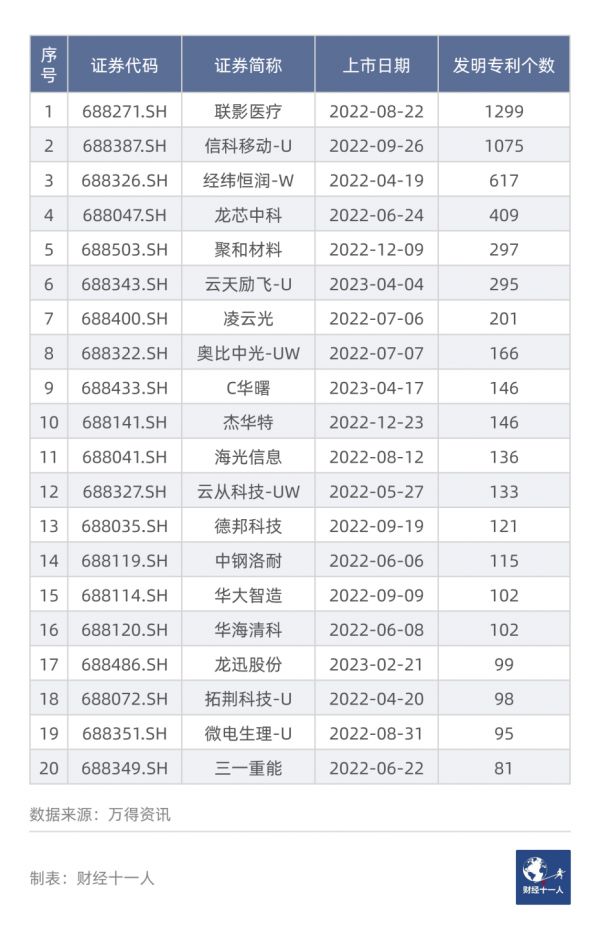 表1是最近一年以来,科创板企业在IPO时拥有发明专利数量最高的20个企业。