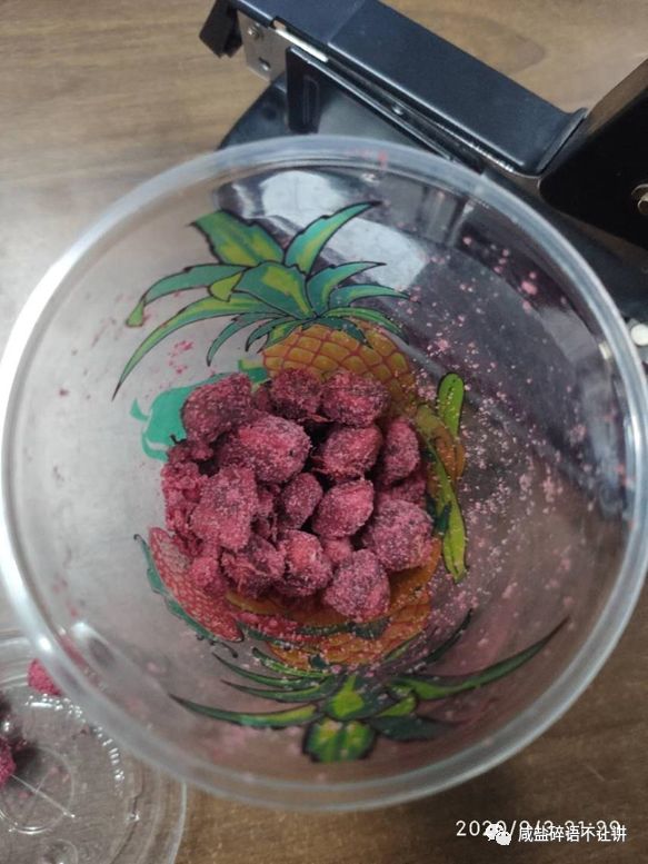 果实长约15至20厘米,有坚硬而脆的外壳,敲开就看到白色果肉,果核包裹在其中。味道酸且微甜微涩,果肉水分含量极少,口感既干又粉。一般小商店会用带颜色的糖腌制后包装出售(如下图),吃起来十分接近糖津杨梅,酸酸甜甜的,区别在于它不具有杨梅果肉的纤维感。
