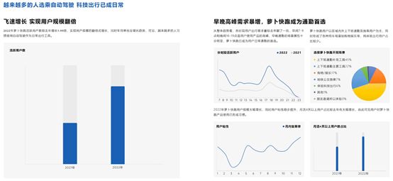 每天的早晚用车高峰时段,萝卜快跑也已成为许多用户的通勤首选。运营数据显示,2022年萝卜快跑在各时段的用户出行需求量较前一年已翻倍,但又以早间7-9点和晚间16-19点为用户使用产品的高峰期,“早晚通勤”的场景属性已非常明显。在使用场景的问题中,也有67%的用户选择将萝卜快跑自动驾驶出行服务作为“上下班通勤补充/主要工具”,同时也存在购物、娱乐等多元化的用车场景需求,而纯体验的用户占比较少。萝卜快跑已经真正融入日常生活,乘坐过无人驾驶的人都会选择更加相信无人驾驶。