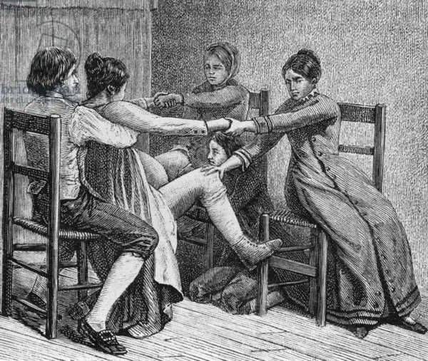 《先驱性的出生场景:两名女性和两名男性在分娩过程中协助》(Pioneer birth scene of two women and two men assist during childbirth of ca. 1800),由Gustave Joseph Witkowski绘制。图片来自ARTSTOR