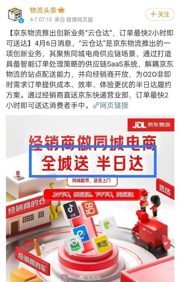 除此之外,京东物流还推出了创新业务“云仓达”,向更多经销商开放了京东物流配送体系资源,为同城电商供应链场景提供了新的履约方案。