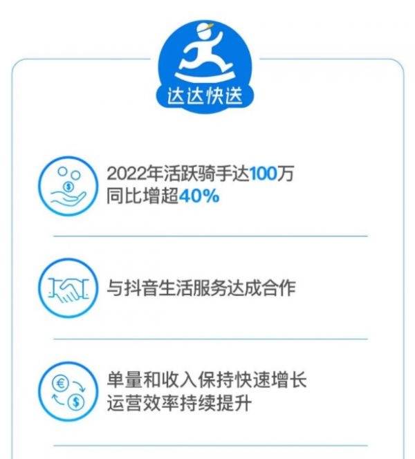 2022年,达达集团总营收达到94亿元,同比增长36%。达达快送和京东到家两大主营业务的表现尤为亮眼,达达快送的活跃骑手数量突破了百万大关,同比增长超40%,而京东到家平台的活跃消费者达到7860万人,活跃门店数超22万家。