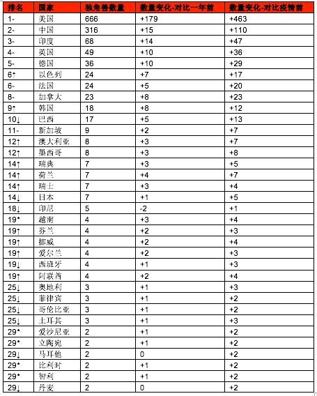 其中,美国以666家独角兽企业领先,比一年前增加179家;中国以316家位居第二,比一年前增加15家;印度以68家独角兽保持第三;英国排名第四,有49家独角兽企业;德国以36家独角兽企业位居第五。